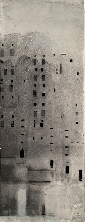 Mixed media on paper glued to board.